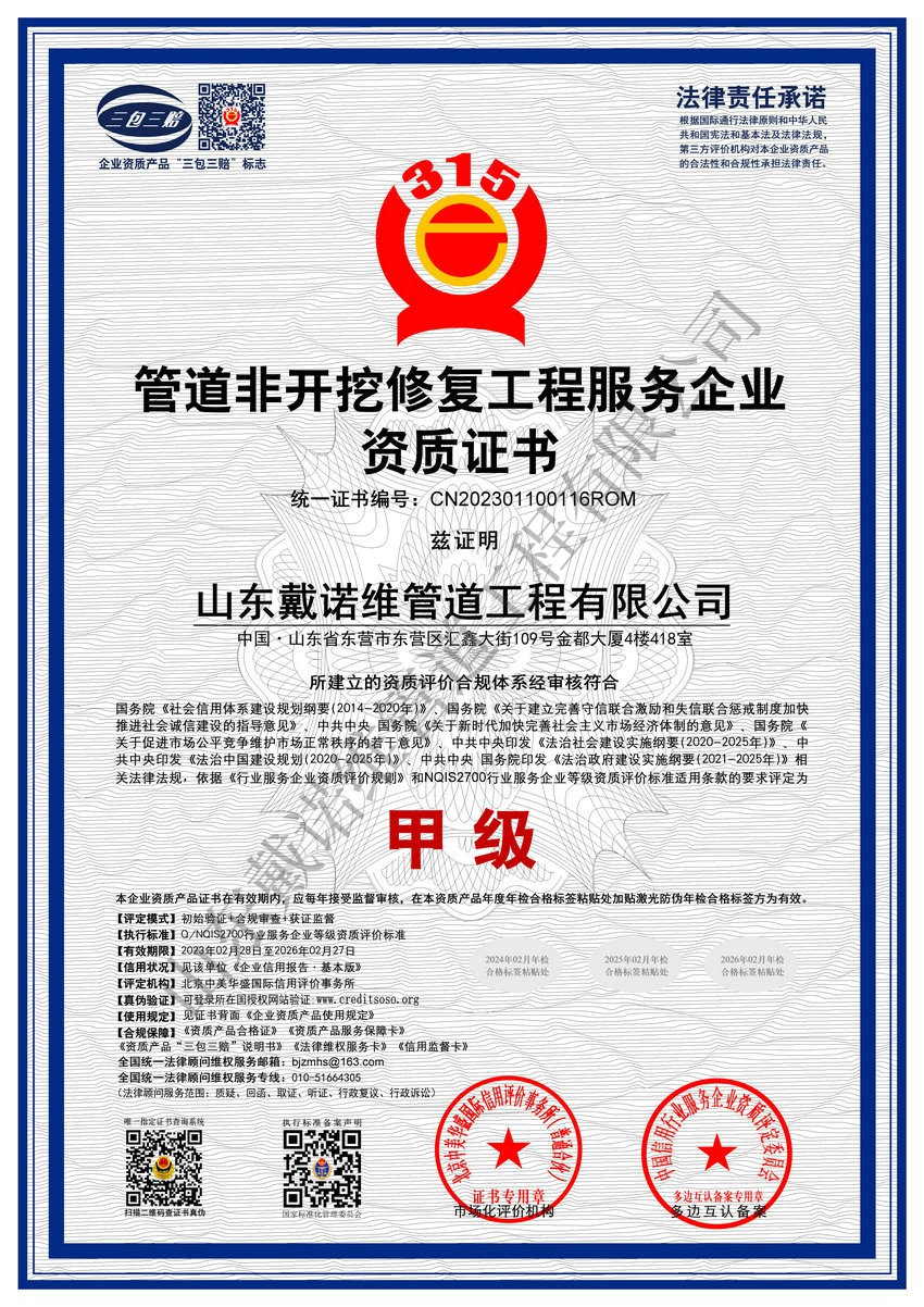 管道非開挖修復工程服務企業資質證書