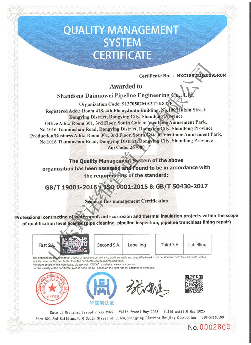管道非開挖修復工程服務(wù)企業(yè)資質(zhì)證書