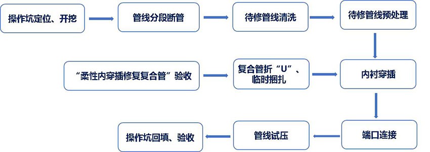 內襯復合軟管的修復工藝是將外徑等于或略小于舊管道內徑的復合管,通過變形設備將柔性復合管軋成“U”型并暫時捆綁使其直徑減小,通過牽引機將柔性復合管穿入舊管道,然后用水或壓縮空氣將其漲開恢復到原來的直徑,使內襯管貼到舊管道的內壁上,形成合二為一的“管中管”復合結構。
